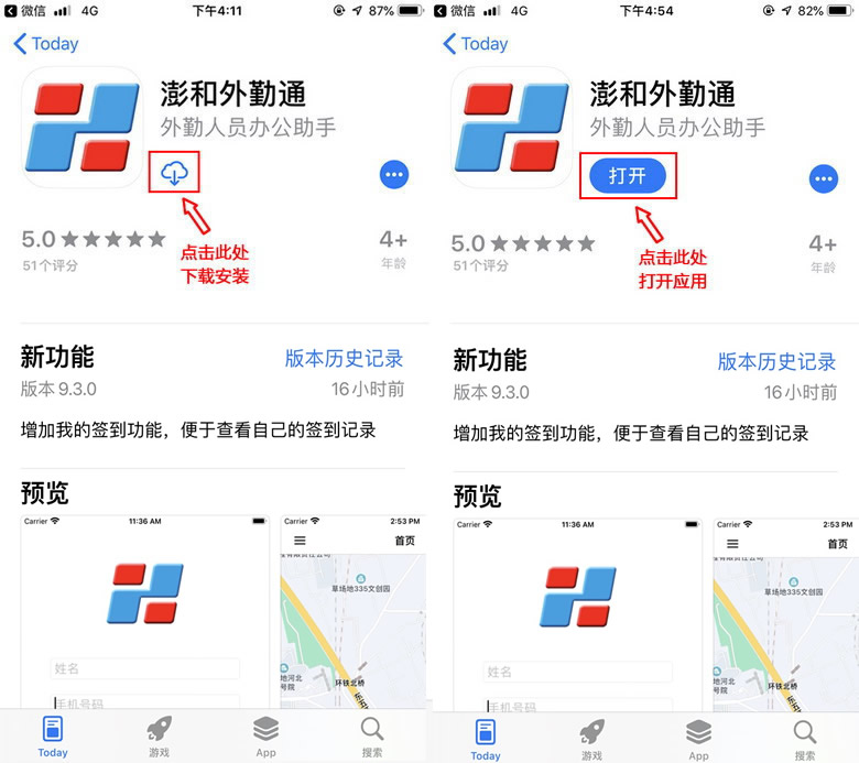 图1 苹果手机下载二维码根据提示打开App Store进入“澎和外勤通”下载页面,点击下载安装“澎和外勤通APP”,安装成功后出现打开图标。