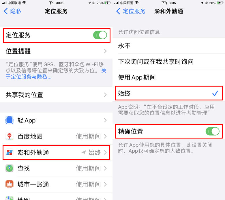 允许“澎和外勤通”在您并未使用该应用时访问您的位置吗?请点击“更改为始终允许”!