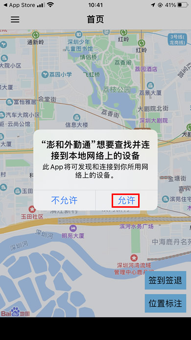 在打开“澎和外勤通”如有提示:“澎和外勤通”要要查找并连接到本地网络上的设备,请点击“允许”!