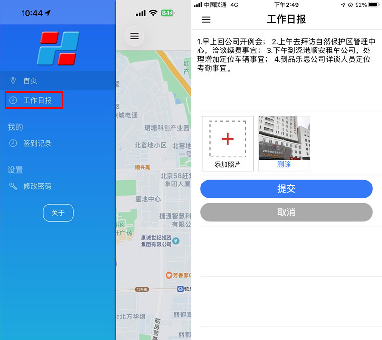 点击“工作日报”,输入相关的内容,“添加照片”选项可以调取相机进行拍照(可以不作操作),点击“提交”按钮,提示“提交成功”,自动返回主页面。