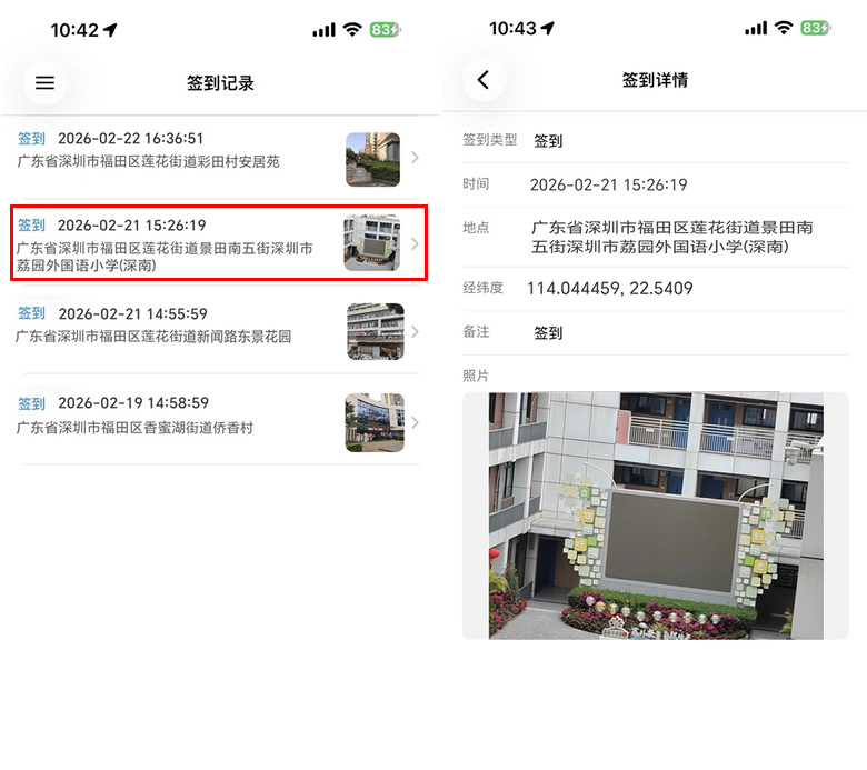 图11 签到签退操作图“签到签退”的所有内容,将会在平台服务器中保存,管理员可以在登陆平台后,可查看到详细的内容,以及上传的照片。