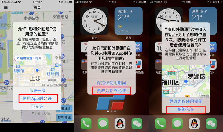允许“澎和外勤通”在您并未使用该应用时访问您的位置吗?请点击“更改为始终允许”!